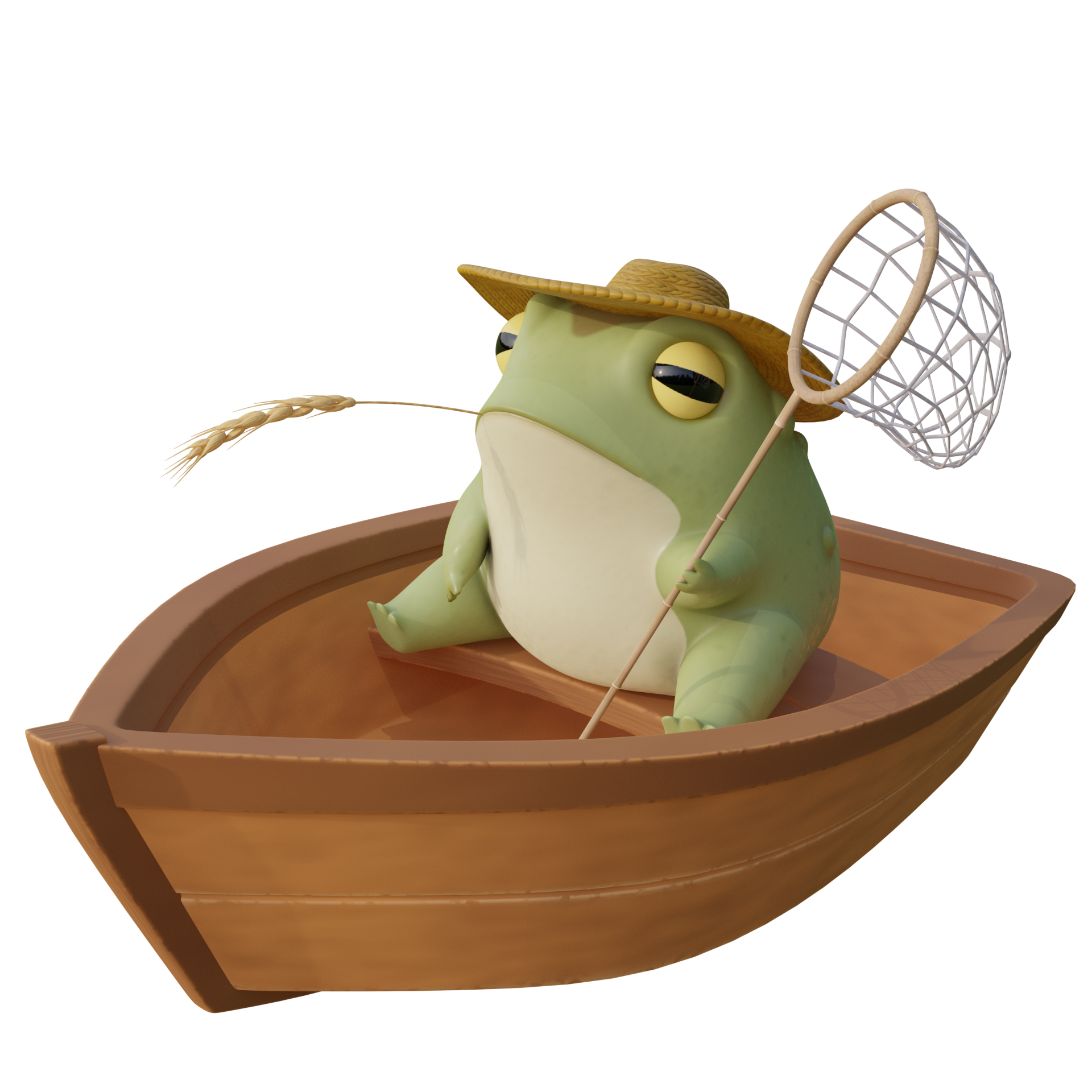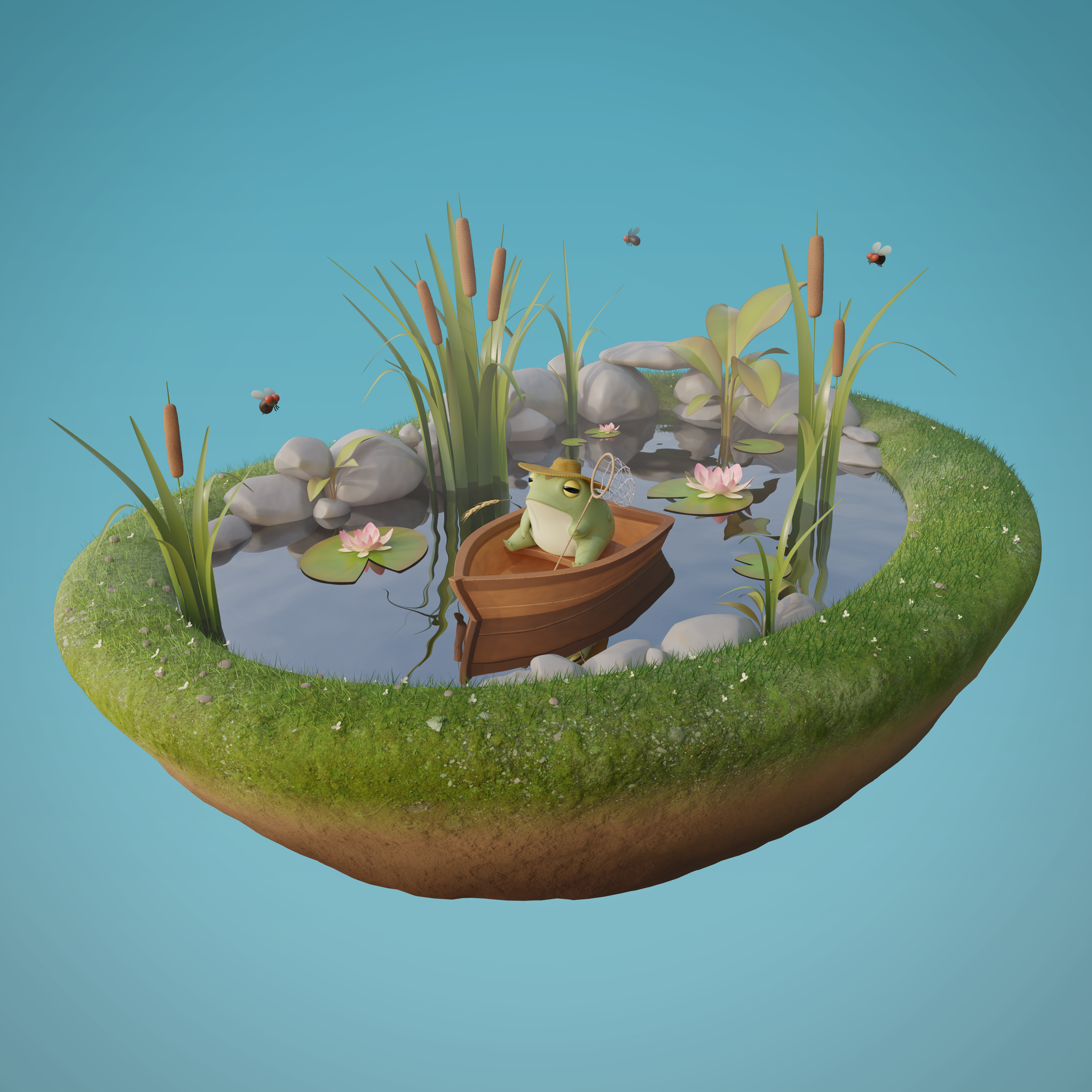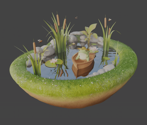 The surfacing for the frog was done in Substance Painter, and the rest of the environment was surfaced procedurally using node graphs in Blender.